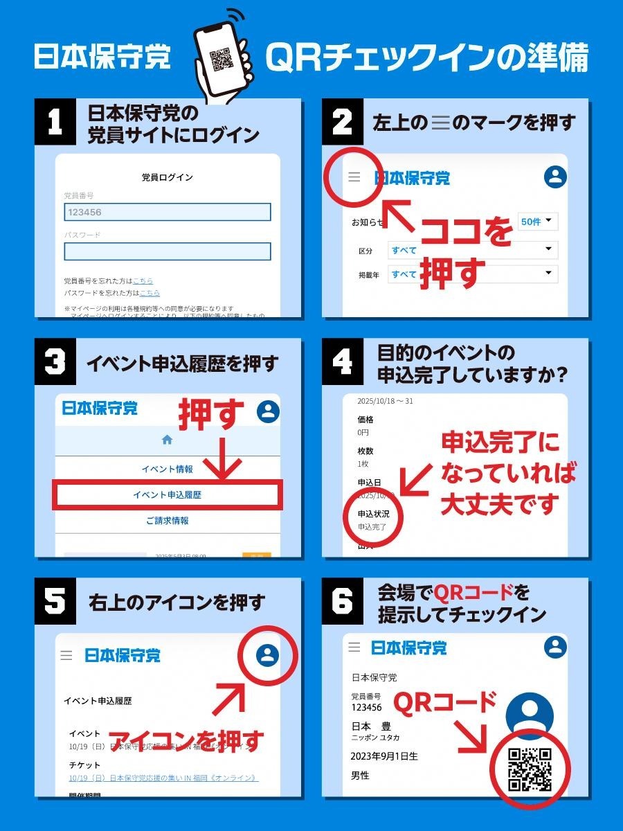 党大会参加のお申込み確認から、当日の会場での入場の方法(QRチェックイン)については以下の図をご覧ください。≫ 党員サイトログインはこちら