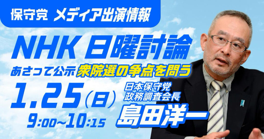 1月25日(日)9:00〜のNHK『日曜討論』に、島田洋一 政調会長が出演いたします。テーマは「あさって公示 衆院選の争点を問う」。ご視聴、応援をよろしくお願いいたします。 -