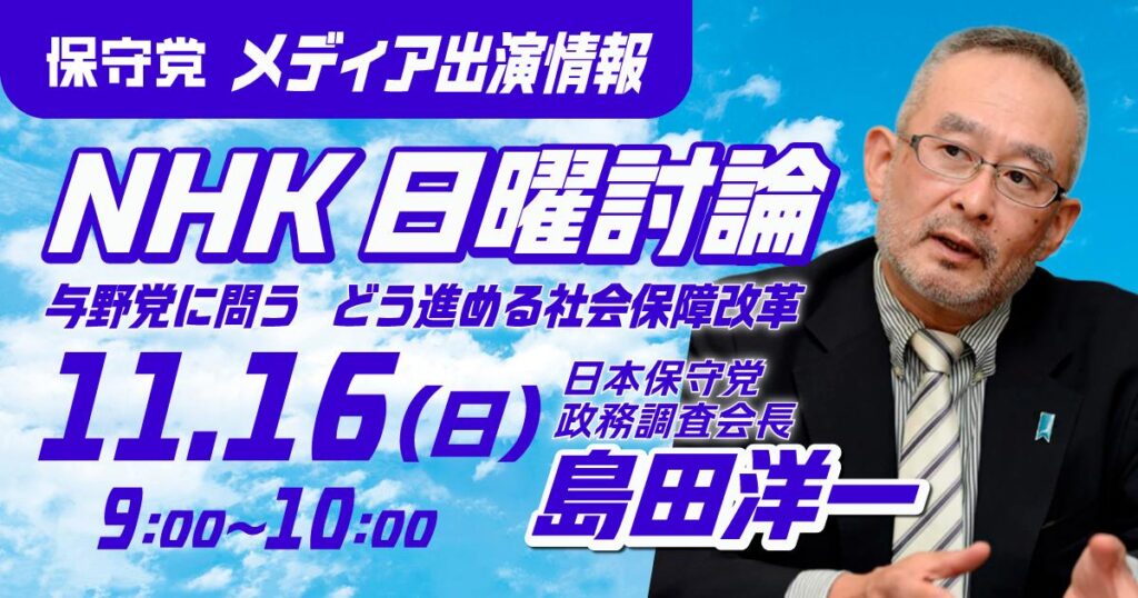 11月9日(日)9:00〜のNHK『日曜討論』に、島田洋一 政調会長が初出演いたします。各党の政策責任者との論戦です。ご視聴、応援よろしくお願いいたします。 -