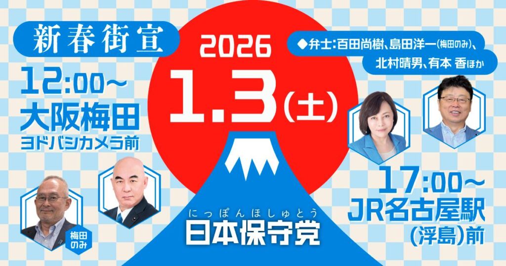 2026/1/3(土)◆12:00〜大阪梅田ヨドバシカメラ前 弁士:百田尚樹、島田洋一、北村晴男、有本香ほか◆17:00〜JR名古屋駅(浮島)前弁士:百田尚樹、北村晴男、有本香ほ... -