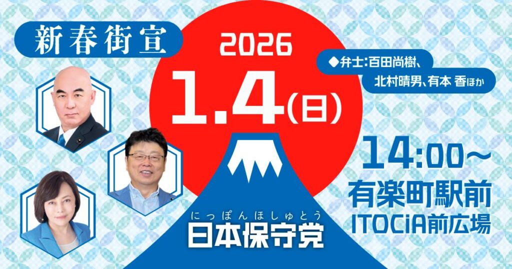 2026/1/4(日)14:00〜有楽町駅前ITOCIA前広場弁士:百田尚樹、北村晴男、有本香ほか皆様お誘い合わせの上、ご参加ください。 -