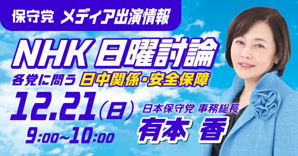 12月21日(日)9:00〜のNHK『日曜討論』に、有本香 事務総長が出演いたします。テーマは「各党に問う 日中関係・安全保障」。ご視聴、応援をよろしくお願いいたします。 h... -