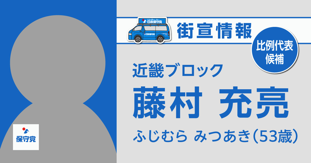 藤村 充亮 街宣情報 2026 1/27 ニュース 衆議院選挙 藤村 充亮 2026年1月27日 目次藤村 充亮 街宣情報はこちら ※移動時間や場所確保の関係上、スケジュールが変更になる場合がございます。最新情報は候補者のSNSをご確認ください。 1月27日 時間:19:00場所:JR大阪駅北口弁士:島田洋一、佐々木みのり、藤村充亮 ニュース 衆議院選挙 藤村 充亮 URLをコピーしました! 石本 崇 街宣情報 佐々木 みのり 街宣情報 関連記事 小澤 倫平 街宣情報 2026年1月27日 梅原 克彦 街宣情報 2026年1月27日 有本 香 街宣情報 2026年1月27日 島田 洋一 街宣情報 2026年1月27日 百田 尚樹 街宣情報 2026年1月27日 佐々木 みのり 街宣情報 2026年1月27日 石本 崇 街宣情報 2026年1月27日 森 けんたろう 街宣情報 2026年1月27日