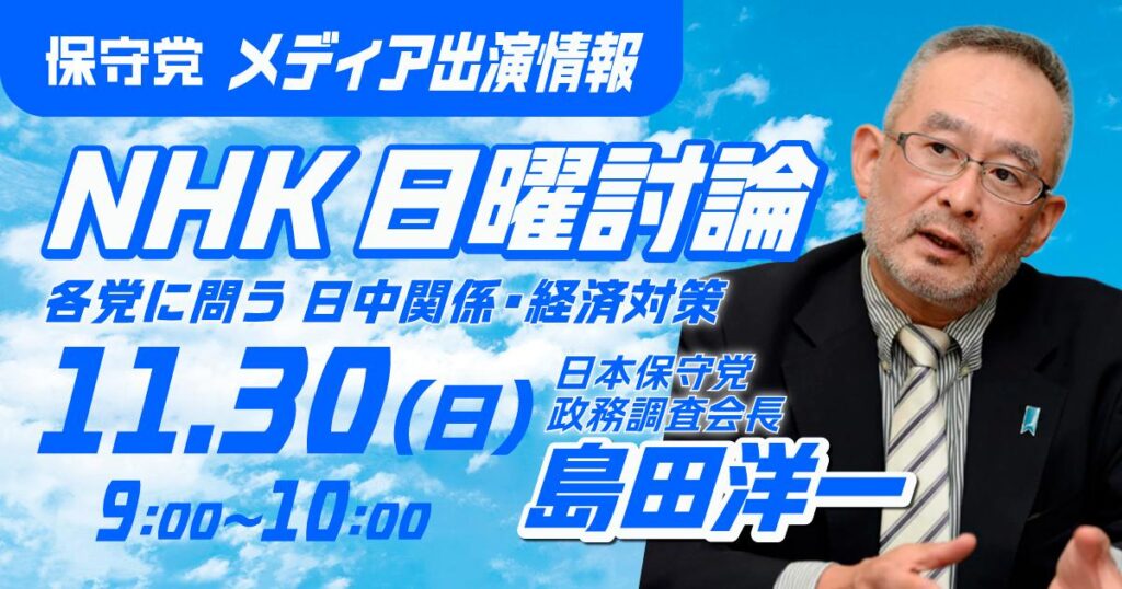 11月9日(日)9:00〜のNHK『日曜討論』に、島田洋一 政調会長が初出演いたします。各党の政策責任者との論戦です。ご視聴、応援よろしくお願いいたします。 -