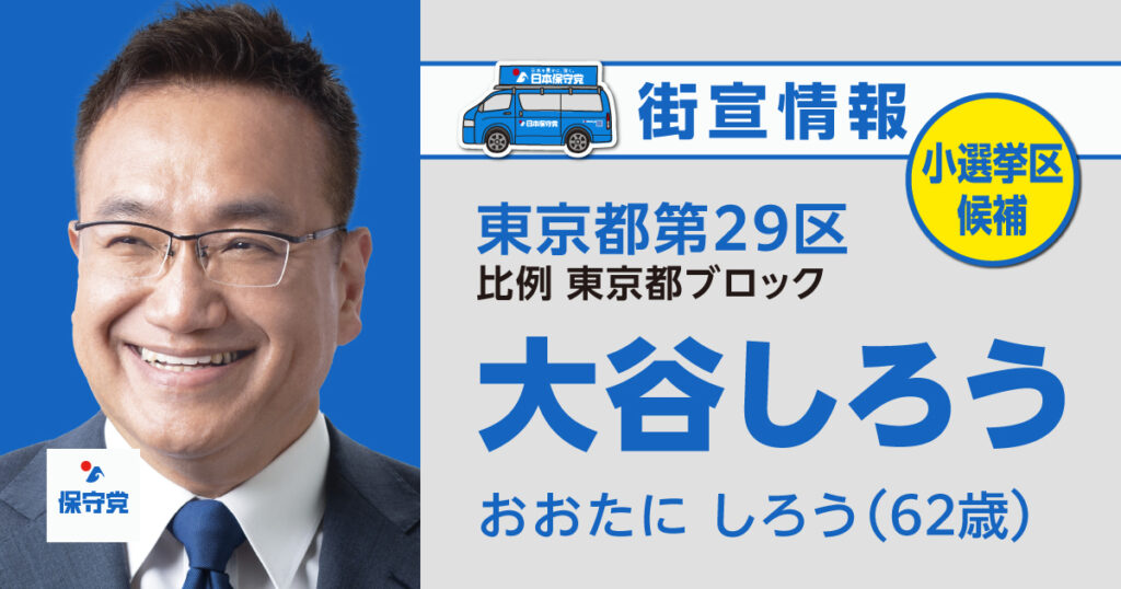 大谷しろう 街宣情報はこちら ※移動時間や場所確保の関係上、スケジュールが変更になる場合がございます。最新情報は候補者のSNSをご確認ください。